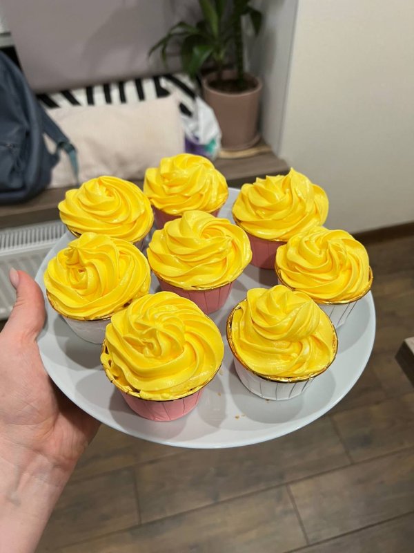 Уже несколько раз окрашивала капкейки натуральными красителями, очень нравится. Цвет обычно получается нежно-желтый, в этот раз добавила побольше, потому что хотелось солнечный оттенок. Получилось ярко и красиво)