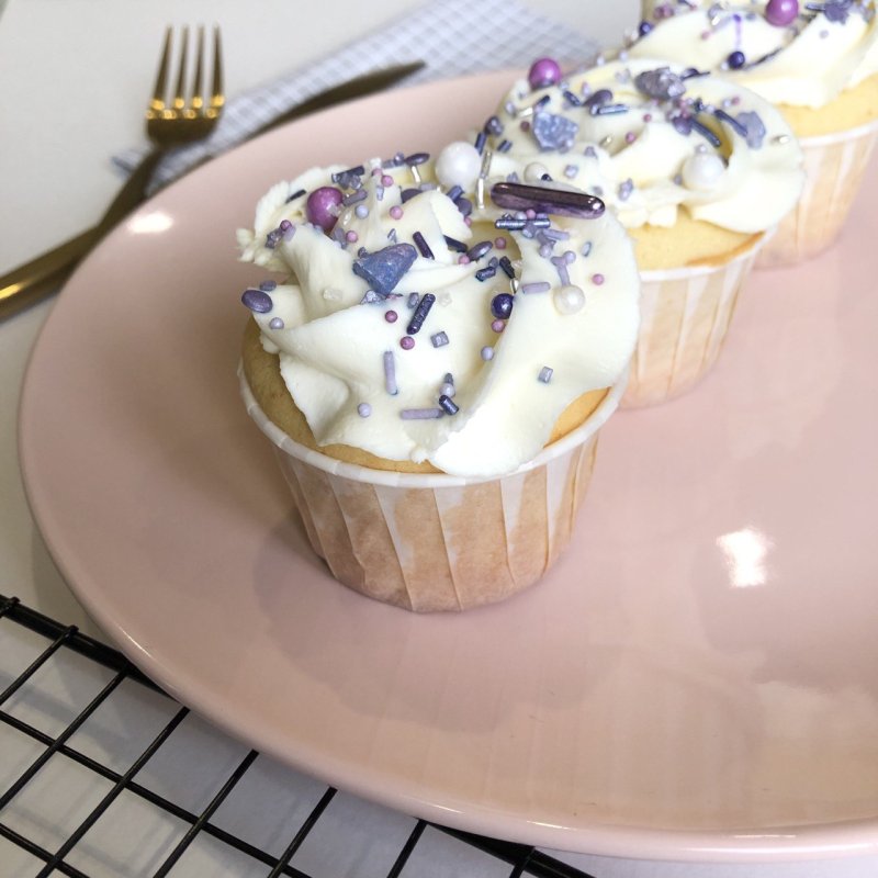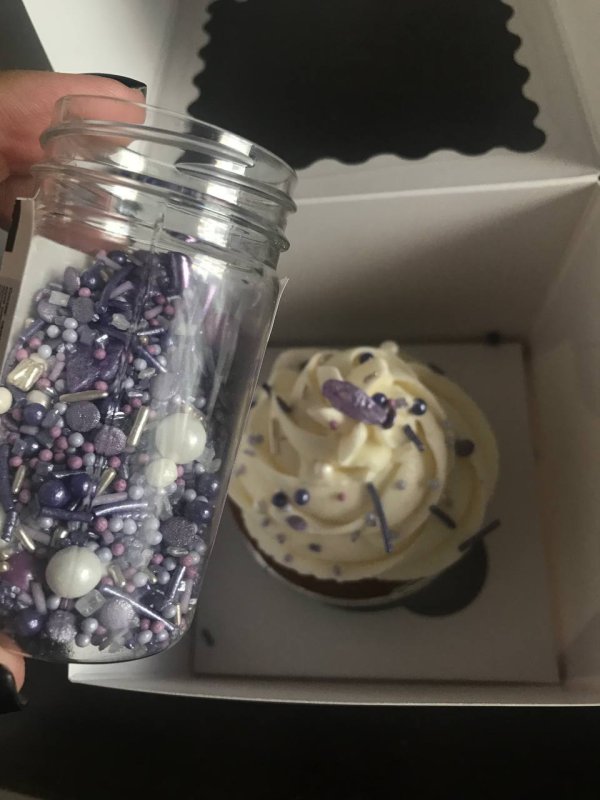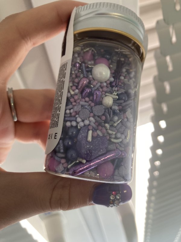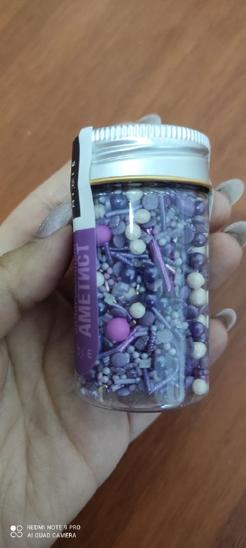Эта посыпка – просто любовь! Цвет шикарный, очень нежный. Прямо pantone very pery, цвет этого года)) Безумно красивые кристаллы в посыпке, смотрятся очень стильно, можно только ради них покупать баночку. Ну и ещё ради палочек фиолетовых, их я тоже часто использую. Единственный минус посыпки – жесткие сахарные элементы, которые не жуются, но для меня это не проблема, потому что я использую посыпку только в качестве декора и перед употреблением десерта убираю все камешки, палочки и большие шарики.