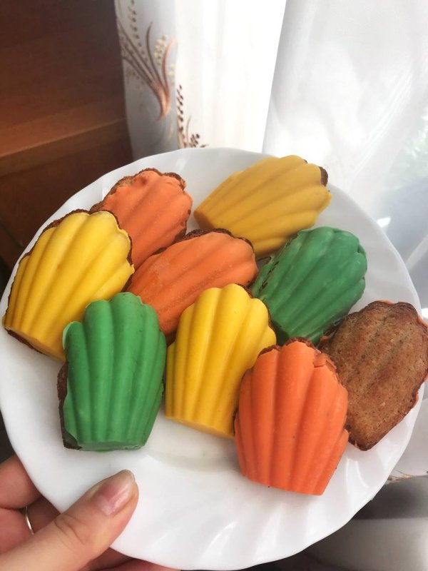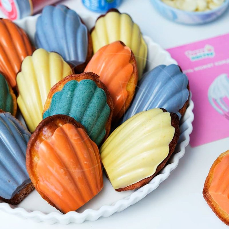 Я думала, что мадленки - это такие печеньки из маминой юности)) А потом увидела в каталоге фото с шоколадным покрытием и влюбилась, тут же заказала форму, шоколад и красители. Форма не очень глубокая, в рецептах советуют заполнить 2/3 формы, но я заполняла ячейку полностью и у меня мадленки получились аккуратно дутыми. Думаю, если положить меньше теста, то они будут просто плоскими. Рисунок красивый, удлиненная ракушечка. Смазывала форму топленым маслом (так было указанно в рецепте) У меня на одну ячейку уходила чайная ложка теста с очень уверенной горкой. Красила красителями mixie.