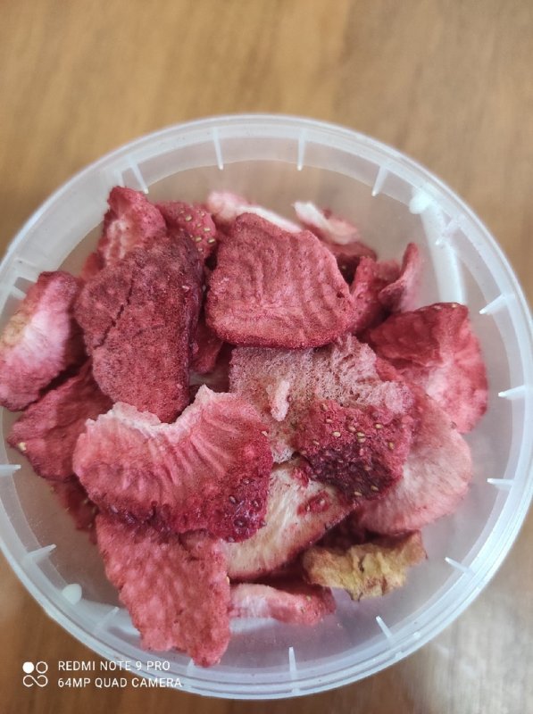 Вкусная клубника)) Кусочки достаточно маленькие Можно посыпать сверху десерта, как украшение, а можно добавлять в крема, крамбл, в начинку моти, клубника напитывается и становится мягкой) Так же ее можно измельчить в порошок и добавлять в тесто для моти, каши и т.д.