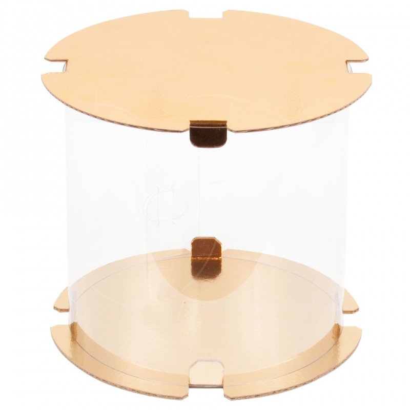 Коробка с пластиковыми боковинами и картонными основаниями отлично подойдёт для безопасной транспортировки и хранения торта. Основания имеют выемки для упаковочной ленты.