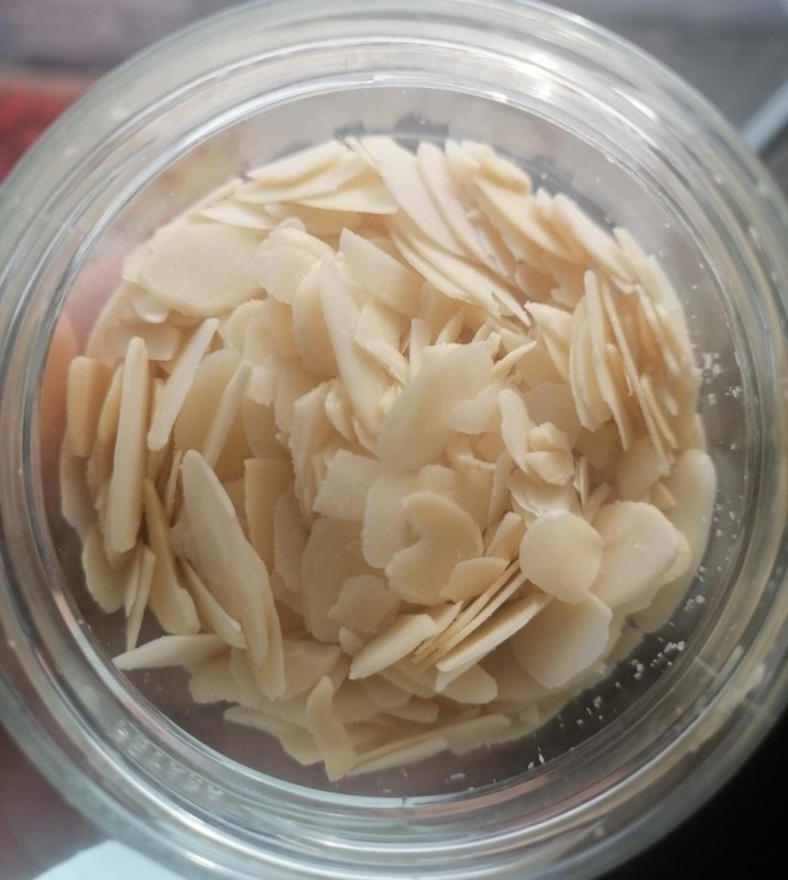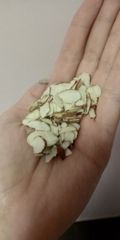 Красивые лепесточки, среднего размера, очень тонкие. Пахнут сырым миндалем, очень нежно. Боялась, что пересылка почтой превратит их в миндальную муку, но в упаковке почти все оказались целыми. Поломыши тоже были на дне, но нем него и совсем без них, наверное, не получится.