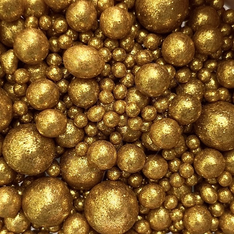 Жемчужная посыпка покрыта ярким пищевым блеском золотого цвета.