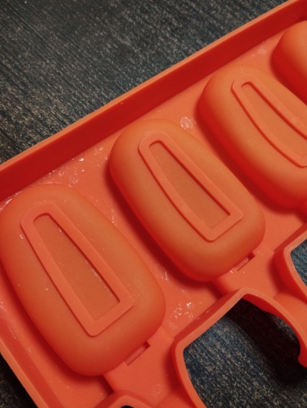 отличная форма для мини эскимо. Я бы сказала – идеальная п размеру для десерта. Силикон мякгий. Но работать с ней можно. Единственное, разрезала пополам, чтобы удобно было замораживать в холодильнике