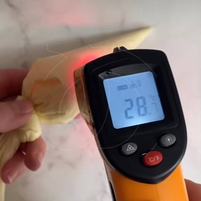 Чудесная вещь, которая облегчит вам жизнь, если вы решили заняться шоколадом и начать темперировать. Конечно, на самом начальном этапе можно пробовать темперировать и с игольчатым термометром, но, поверьте, вы просто измучаетесь и это отобьёт у вас всё желание учиться темперировать. Я ничуть не жалею о потраченных деньгах на пирометр, он свою функцию выполняет на все 100%. Темперировать с ним одно удовольствие, всё очень быстро. Сам пирометр удобно лежит в руке, можно переключать градусы (как градусы Цельсия, так и градусы Фаренгейта).