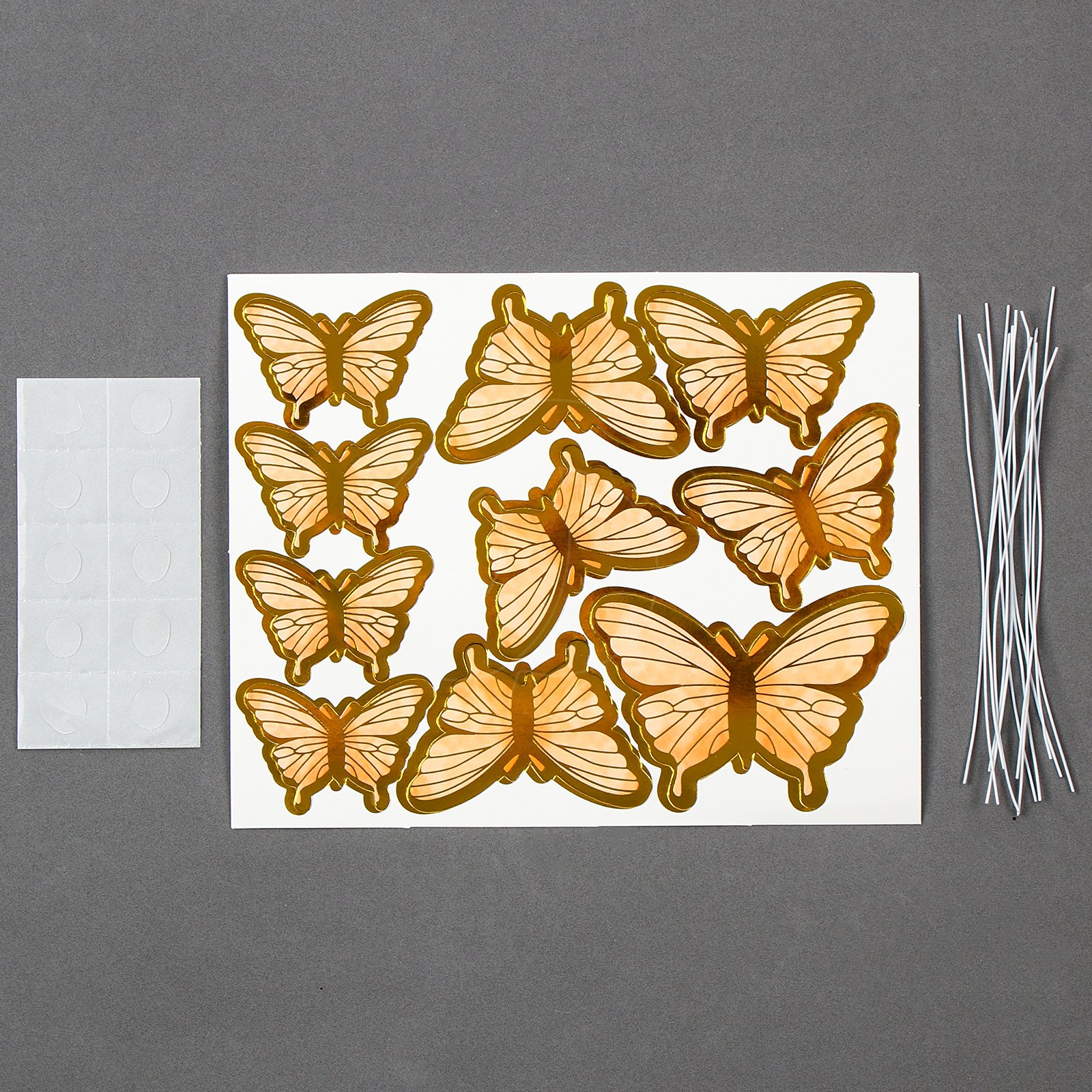 В набор входит 10 бабочек разного размера, 10 проволочек и 10 клеевых точек.