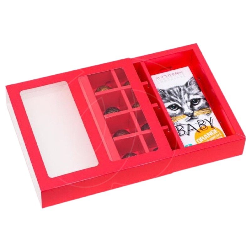 Коробка на 8 конфет и шоколадную плитку с окном красная