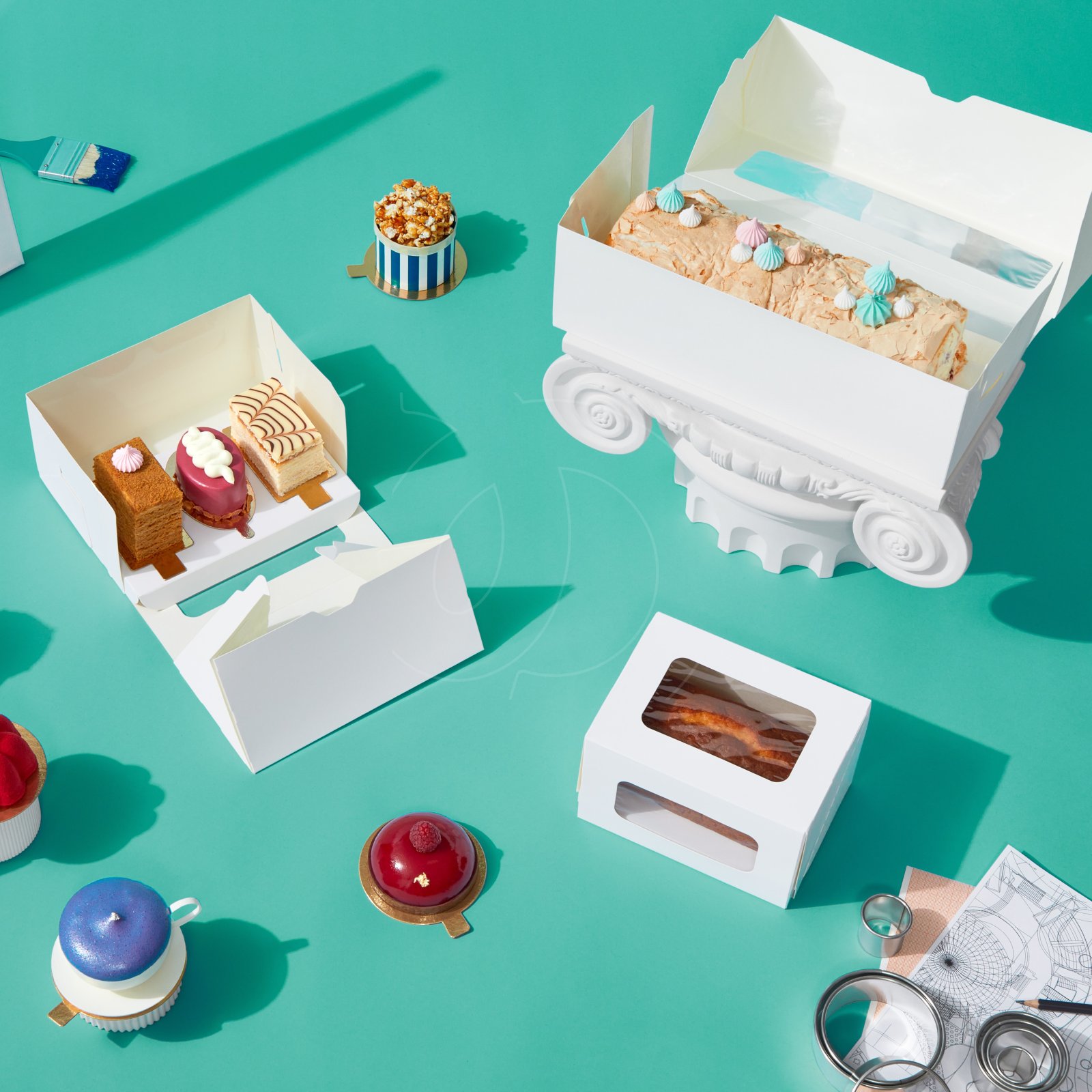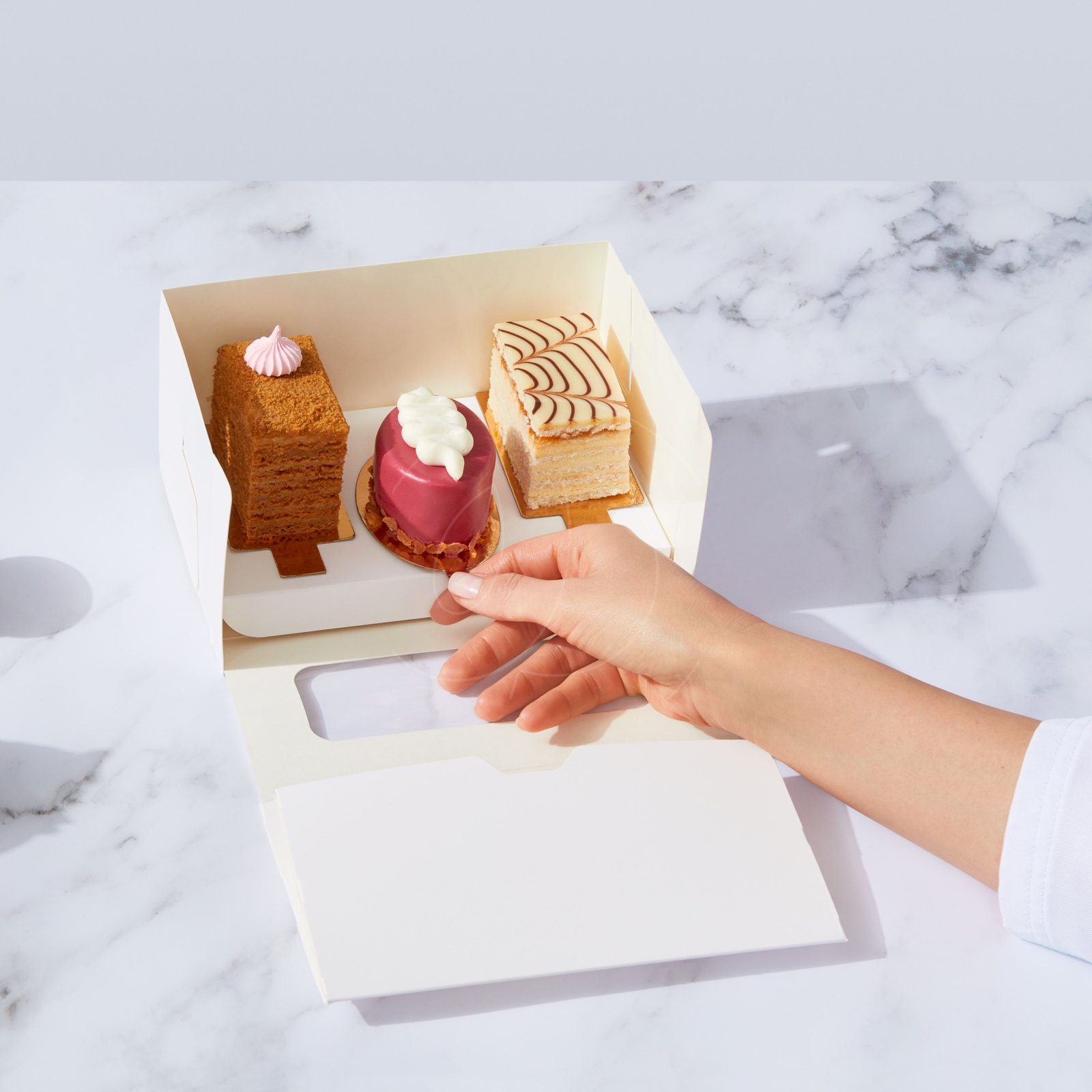 Придайте коробке форму, поместите десерт внутрь и закройте крышку.