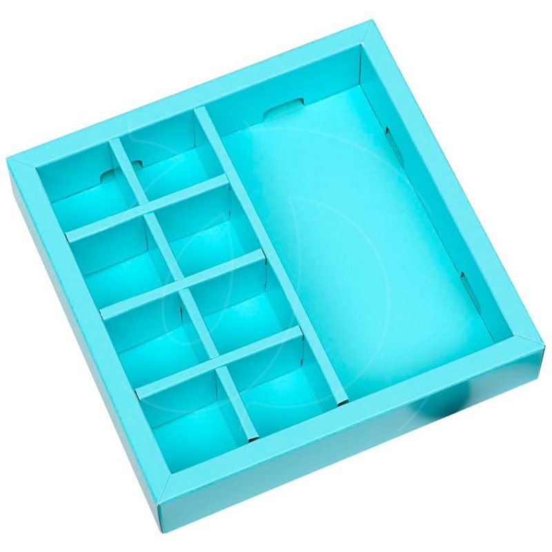 Коробка на 8 конфет и шоколадную плитку с окном голубая 17,7х17,8х3,85 см