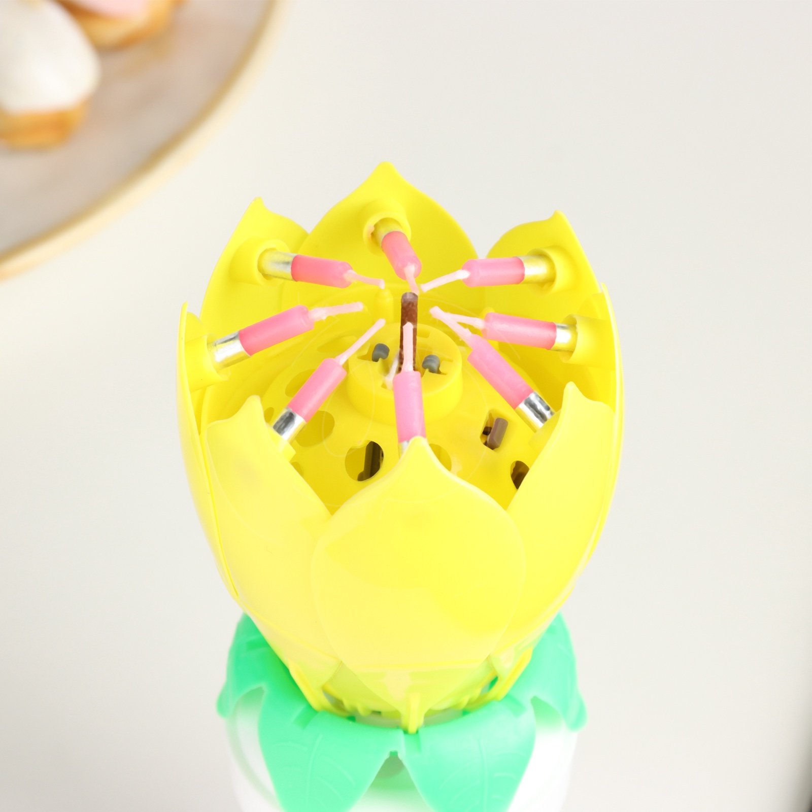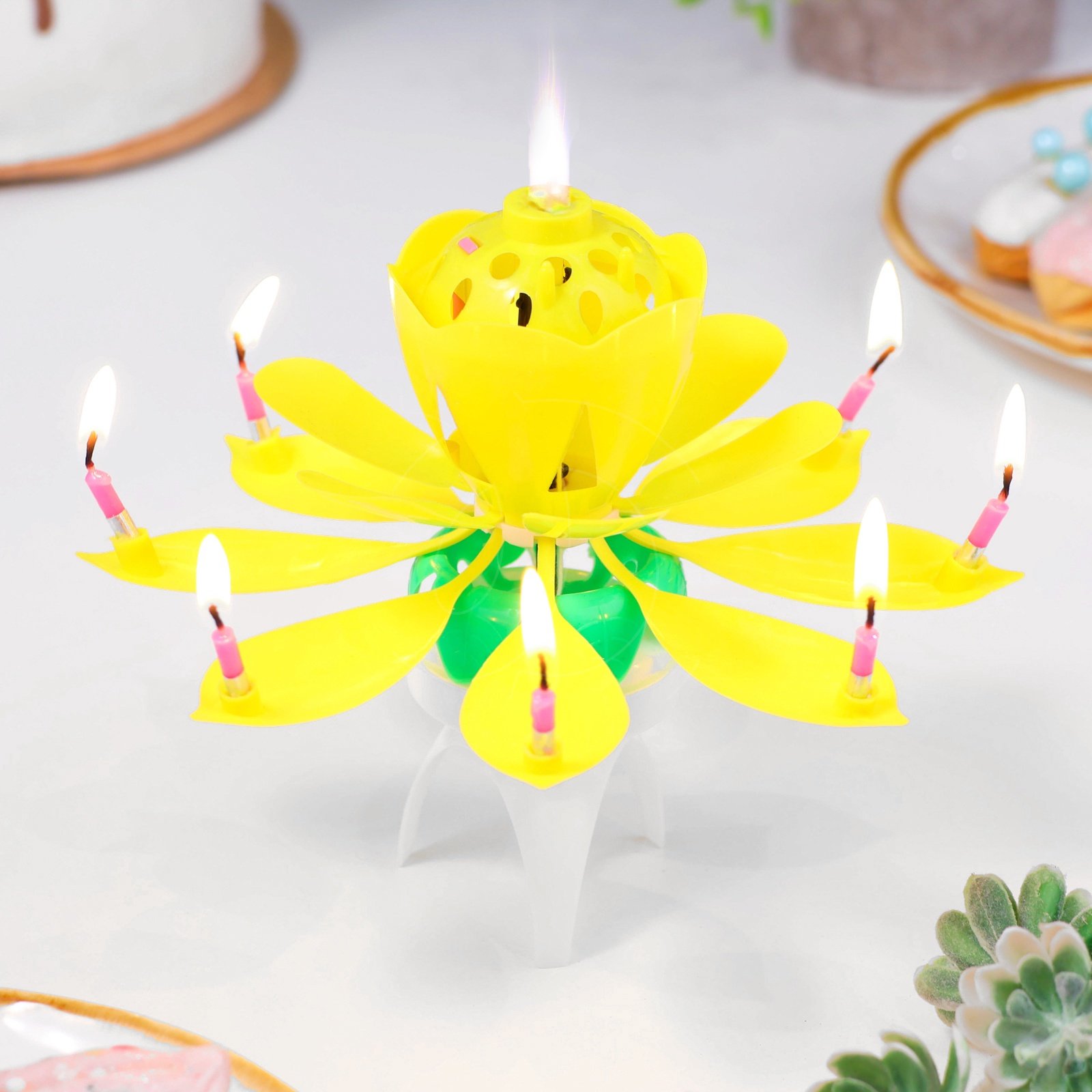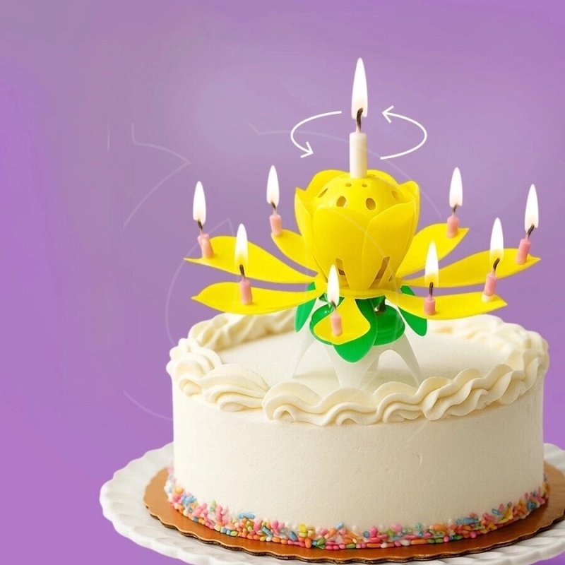 После этого цветок раскроется, загорится 8 дополнительных свечек, заиграет музыка, а тюльпан начнет вращение.
