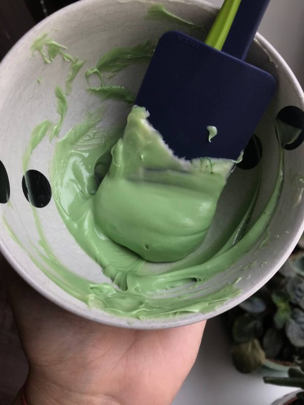 Просто волшебный жирорастворимый краситель. Распределяется легко. Он преобразит ваш шоколад от нежно-салатового до темно-лиственного. Я добавила прям чуть-чуть, меньше, чем на кончике ножа и получился такой божественный цвет думаю, если покрыть тортик ганашем такого цвета, будет очень выигрышно.